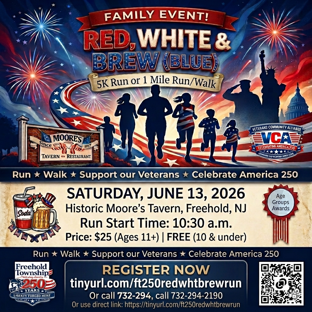 Join Freehold Township and the Veterans Community Alliance in celebrating America’s 250th with a patriotic 5K Run and 1-Mile Fun Run/Walk benefiting local veterans.