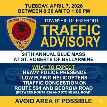 Traffic Advisory: Tues, April 7, 8:30 AM–1 PM for the Blue Mass at St. Robert Bellarmine. Expect increased police presence, low-flying helicopters, and delays near Route 524 & Georgia Rd (between Route 524 & Stone Hill Rd). Avoid the area if possible.